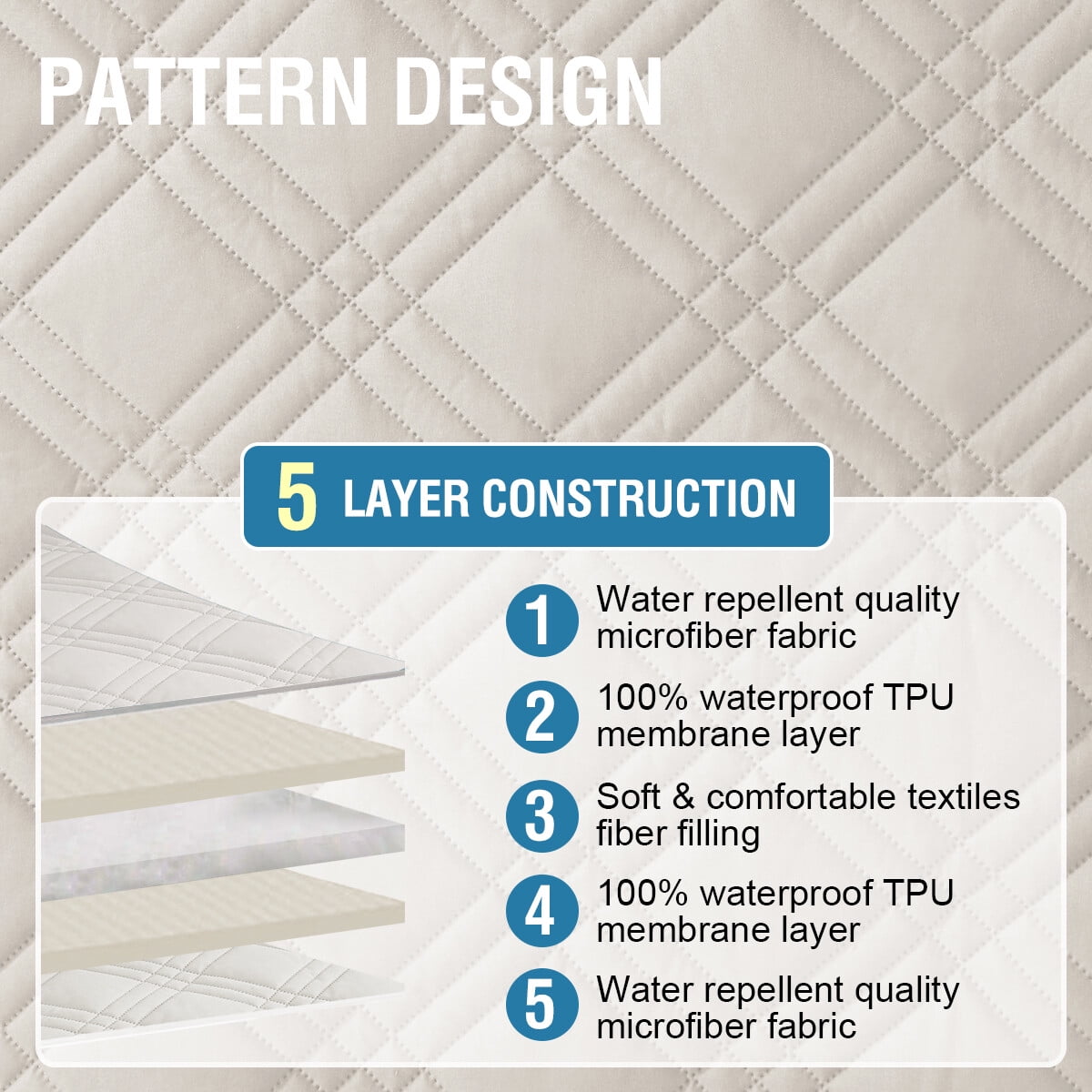 - 100% WATER RESISTANT - Our premium sofa slipcover is made with 5 layers of fabric, with both the front and back surfaces utilizing water-resistant technology. The reverse side is enhanced with 100% waterproof TPU composite technology. Seams are reinforced with widened edging strip, ensuring that while maintaining the dual-sided pattern, the fabric achieves 100% waterproof effectiveness.